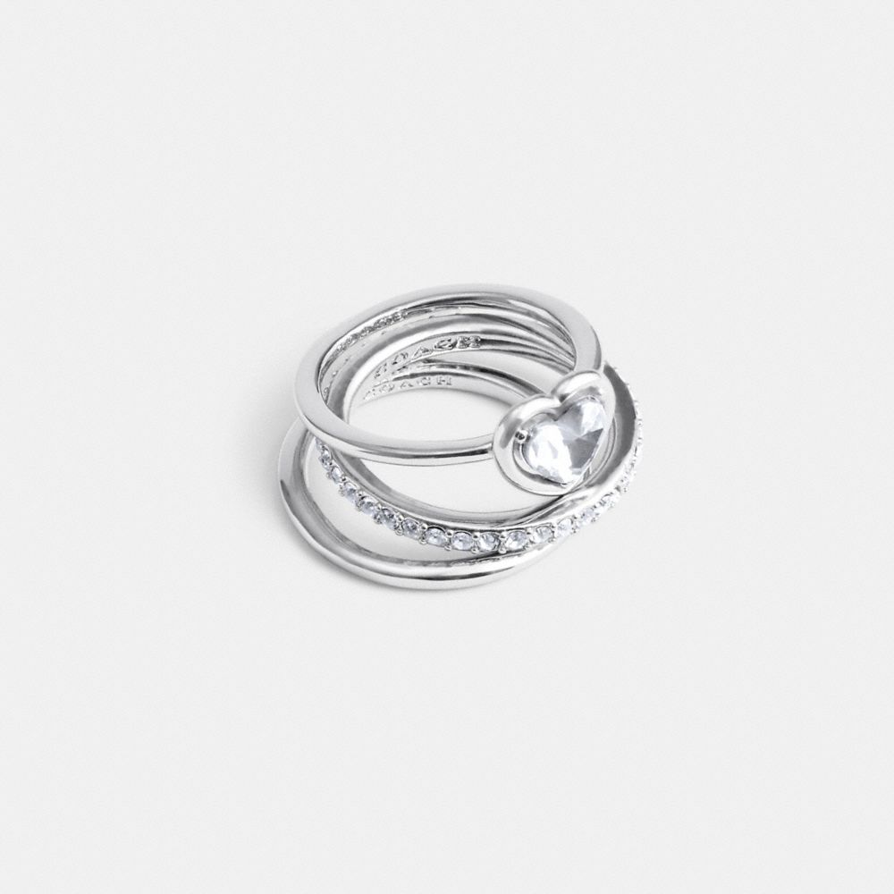 This set of stackable rings add a touch of sparkle to any look. It includes one polished band, one pavé band and a heart bezel-set crystal ring. Wear together or separately.